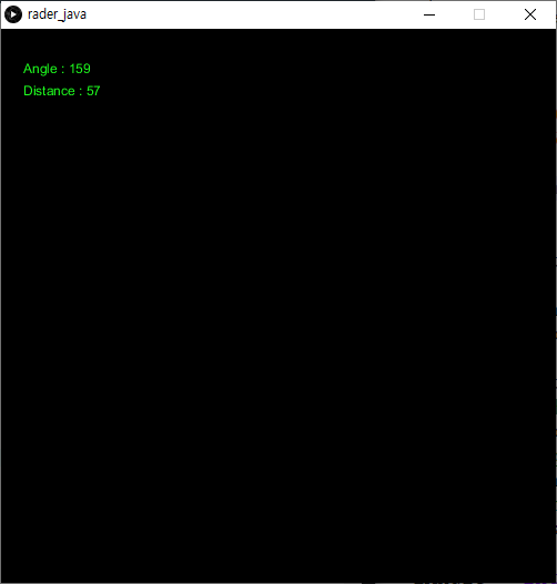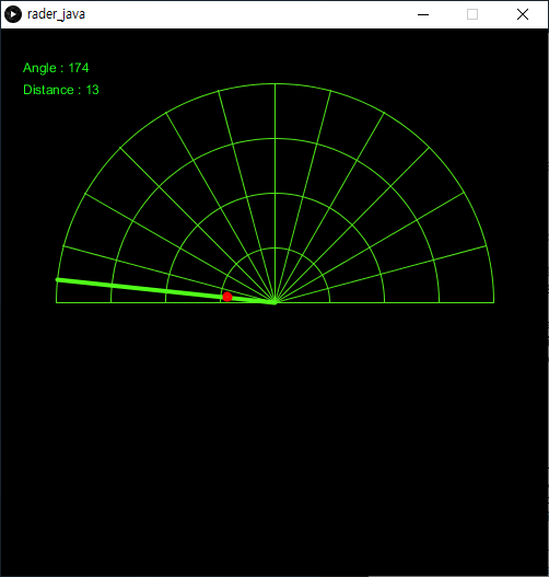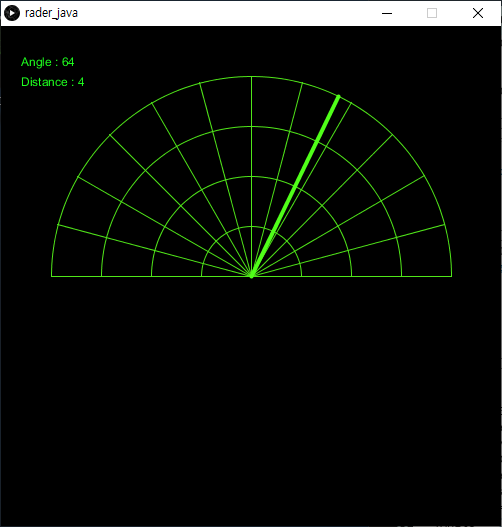 보이다 싶이 이전 소스코드와는 많이 달라졌다. 그래도 주석을 달아놨으니 이해하는데는 크게 어려움이 없을 것이다. 그렇다면 왜 이렇게 바꾸었는지 설명하자면 결론은 소스코드를 보기 쉽게(관리하기 쉽게)하고 레이더를 꾸미는 부분과 통신하는 부분을 나누려고하기 때문이다. 사실 초심자 분들에게는 이게 더 복잡해 보일거라 생각이 든다. draw() 에서는 최대한 시각적인 표현을 하는데 중점을 두고 serialEvent() 에서는 통신 부분을 처리할 것이다. 코드를 실행시켜보면 아래와 같은 화면이 생성될 것이다. 이제 각도 값과 거리 값이 확실하게 눈에 들어온다. 이 값을 사용하여 레이더를 꾸며보자.