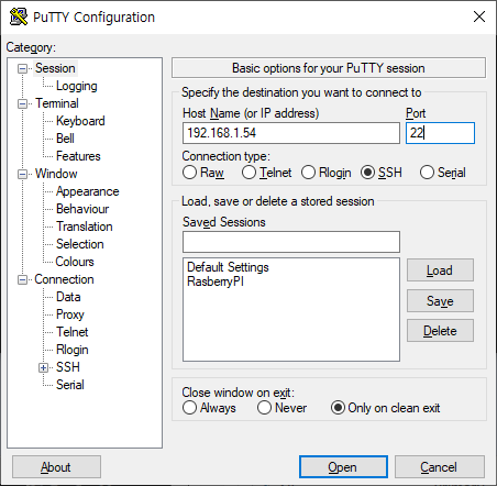 위에서 다운로드한 Putty 프로그램을 실행 후 라즈베리파이의 IP주소를 Putty에서 "Host Name(or IP address)" 란에 적어주고 아래 "Open" 버튼을 눌러줍니다.