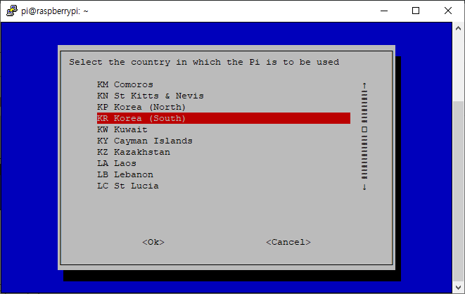 처음 연결하는 상황이라면 아래와 같은 화면이 출력되는데 라즈베리파이가 사용되는 위치를 선택해줍니다. 외국이 아니라면 KR Korea (South)를 를 선택하면 됩니다.