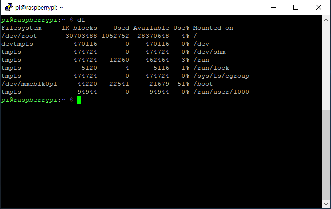 df 명령어를 사용합니다. 이 명령어로 라즈베리 파이가 사용하고 있는 드라이브 목록을 보여주며 /dev/root의 사용 가능 용량이 32 GB로 늘어난 것을 볼 수 있습니다.