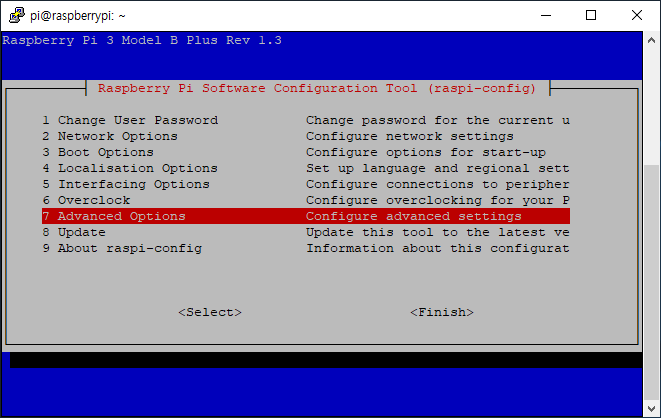 sudo raspi-config 명령어로 라즈비안 설정 화면을 열어준 뒤 "Advanced Options"를 를 선택합니다.