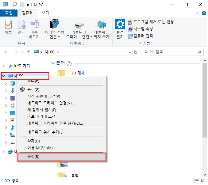 내 컴퓨터에 오른쪽 버튼을 눌러 속성을 클릭합니다.